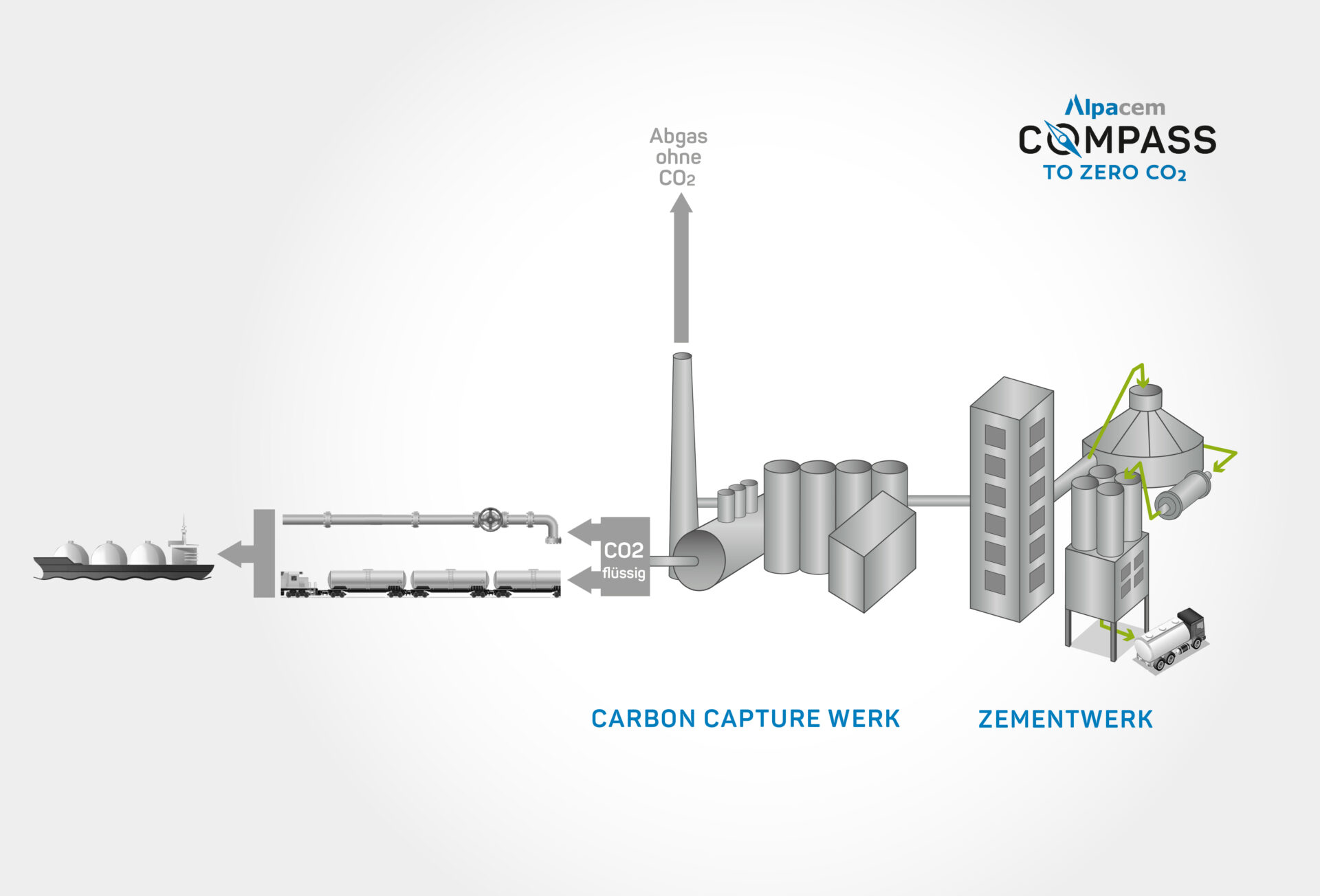 Anche dopo tutte le ottimizzazioni, ci sono ancora emissioni che non possono essere evitate. Per impedire che la CO₂ entri nell’atmosfera e raggiungere così la neutralità di CO₂, queste emissioni residue devono essere separate dal flusso dei gas di scarico e immagazzinate (CCS – carbon capture storage) o riutilizzate (CCU – carbon capture utilization). Per gli impianti cementiferi completamente integrati, ciò sarà possibile ampliando e adattando la tecnologia degli impianti del futuro e, a seconda della tecnologia di separazione, apportando modifiche agli impianti esistenti.